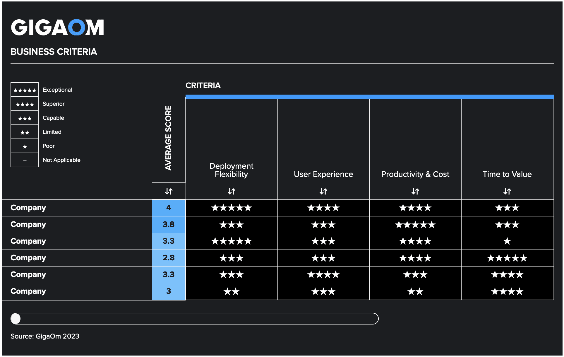 The GigaOm Radar synthesizes our practitioner-led, data-driven analysis of a technology sector. GigaOm analysts select solutions based on support for table stakes—features we expect all solutions in the sector to provide. They then score both the capabilities that differentiate solutions (Key Features) and the non-functional requirements that impact the value solutions have to the organization (Business Criteria). Vendors are positioned on the Radar chart based on their relative scores.
