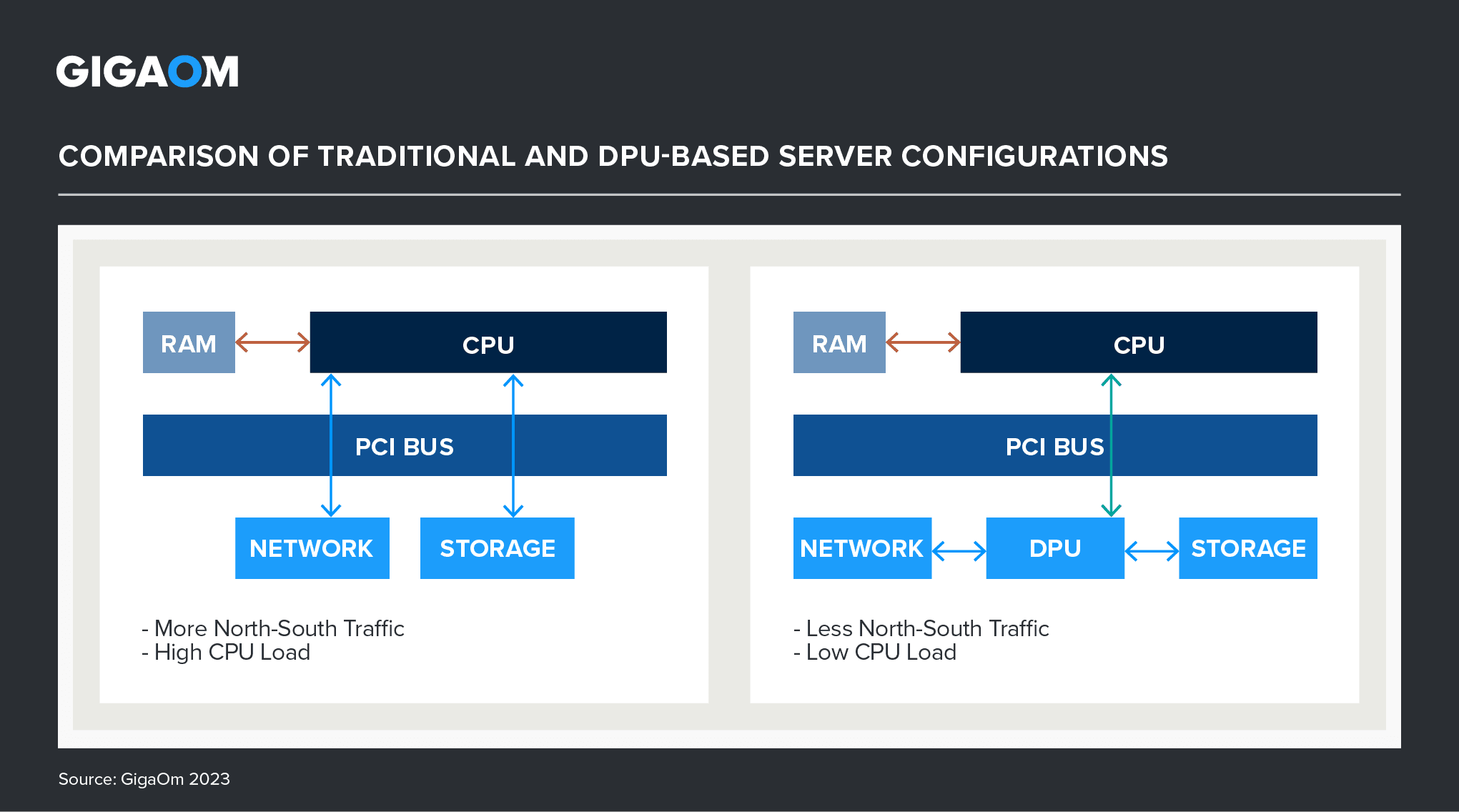 Figure 1 highlights the difference between traditional servers (left) and those with DPUs (right).