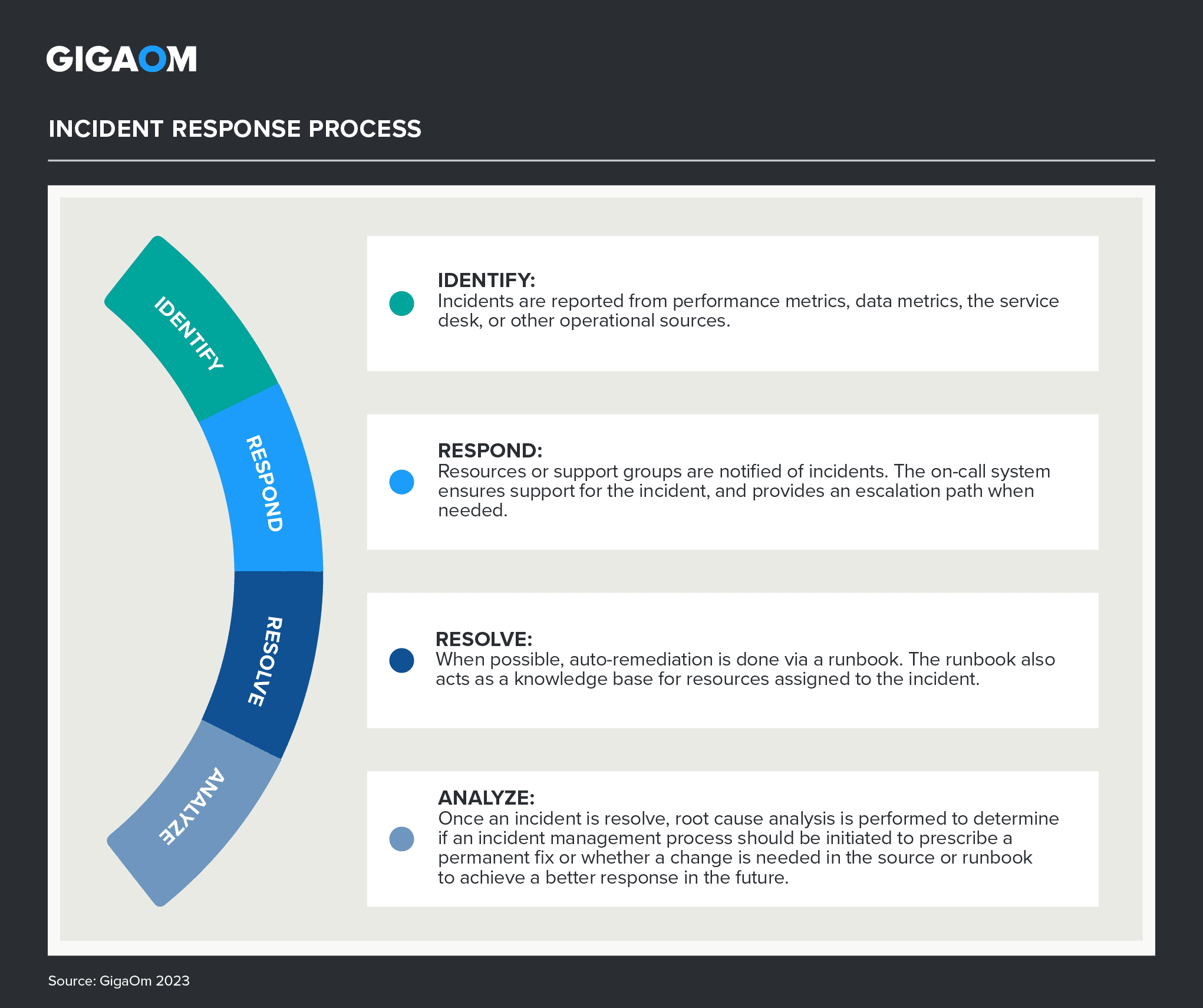 The incident response process is shown in Figure 1 below. Incidents must be identified and may be reported from any source including observability data, AIOps analysis, the service desk, or network management. Response includes notification, support, and if necessary, escalation to the appropriate resources. The intent of the response, whether human or digital, is to resolve the incident in the shortest amount of time. Resolution of the issue may be handled by an individual or automatically from a defined workflow. Once the incident is resolved and normal operations are restored, the ability to analyze the incident, learn from it, and update workflows or runbooks becomes important to improve responses to future incidents.