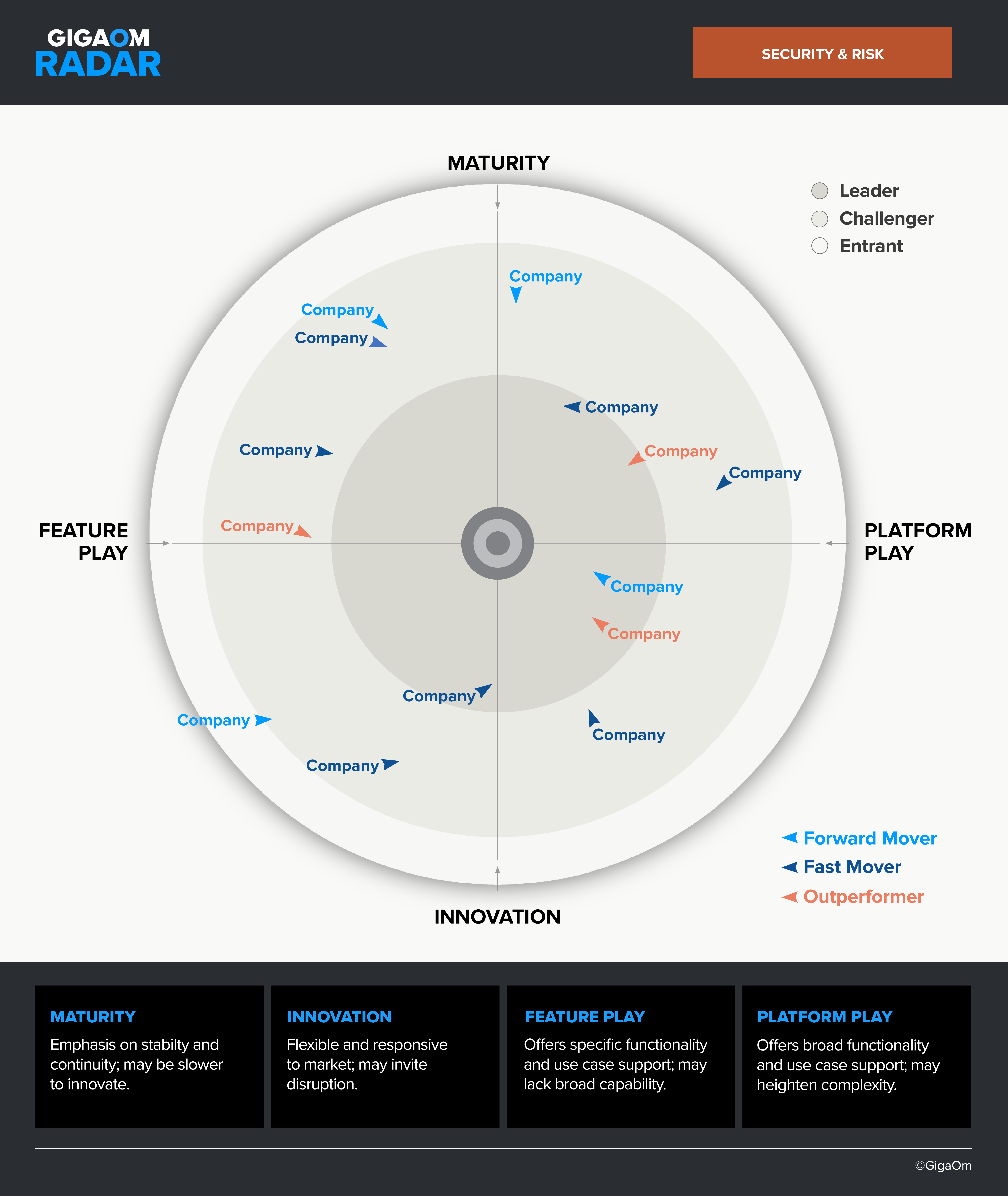 The Radar offers a forward-looking assessment, plotting the current position and projected advancement of each solution over a 12- to 18-month window. Color-coded arrowheads indicate progress based on assessment of strategy and pace of execution, with vendors designated as Forward Movers, Fast Movers, or Outperformers based on their rate of progress (organizational and technological change) compared to the market.