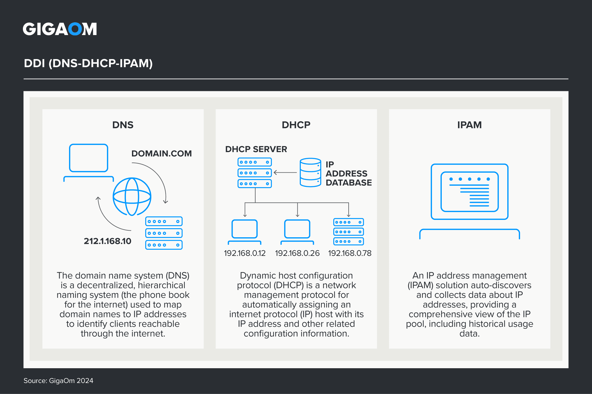 As enterprises adopt more cloud-based solutions, take advantage of hybrid networks, and deploy more IoT devices, IP address management becomes more complex and efficient management more critical. DDI (DNS, DHCP, and IPAM) solutions integrate three core components of network management into a unified platform, providing a centralized approach to managing IP addresses, domain name resolution, and dynamic IP address assignment. This integration is crucial for maintaining efficient and secure network operations.