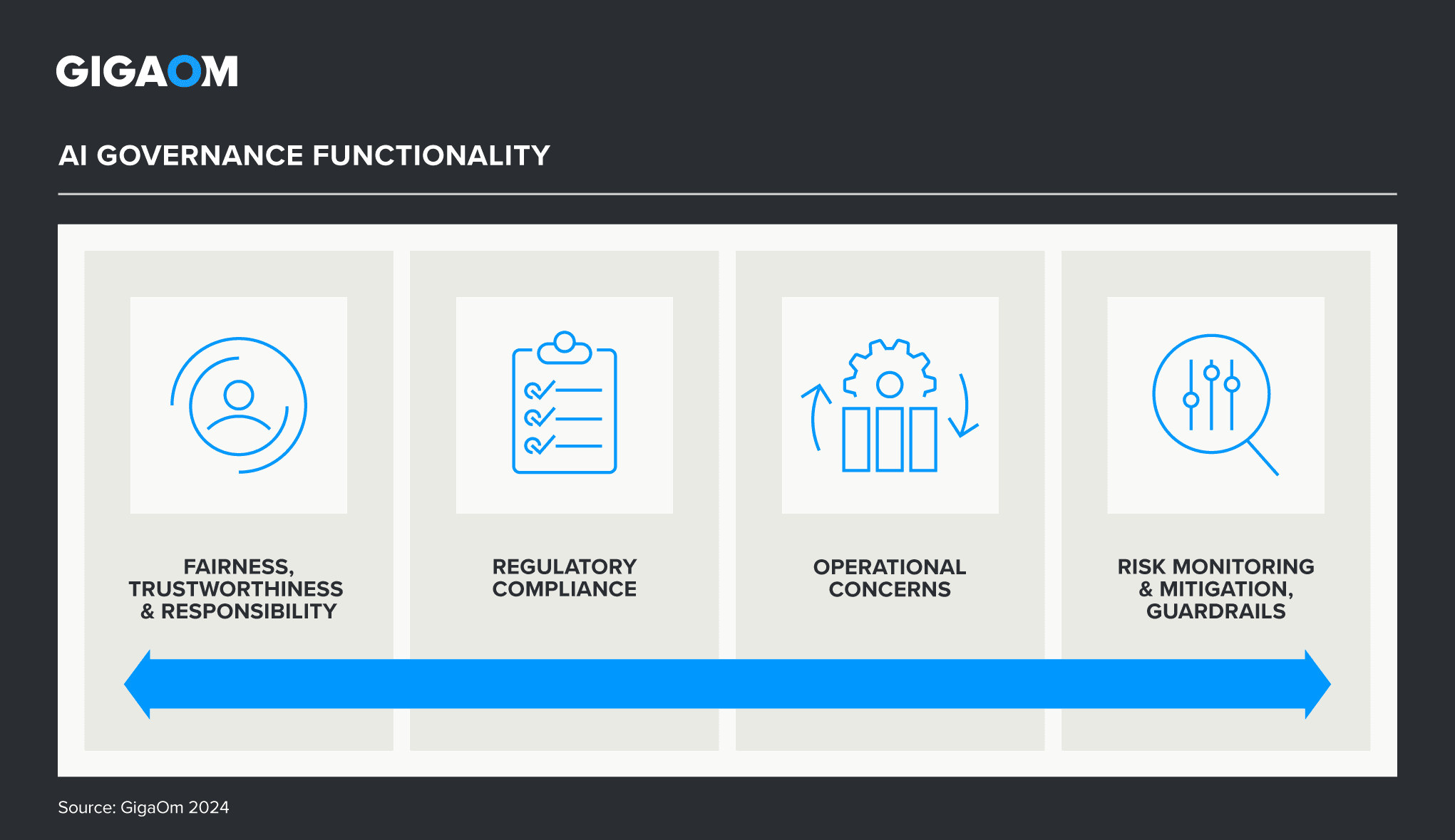 Standardizing the definition of AI governance is a battle, but one which must be fought. There are different fronts in this conflict, and vendors fight harder or allocate more resources to particular ones. Some vendors focus on fairness, trustworthiness, and responsibility in AI, while others emphasize regulatory compliance. Many concentrate on operational issues and some are obsessed (in a positive way) with risk monitoring and mitigation. The last of these includes minimizing large language model (LLM) “hallucinations,” maximizing contextual relevance, preventing harmful or offensive content, and protecting against exfiltration of sensitive or proprietary data, whether in prompts or in output or responses. Figure 1 illustrates the major areas of AI governance functionality emphasized by the various vendors whose platforms are profiled in this report.