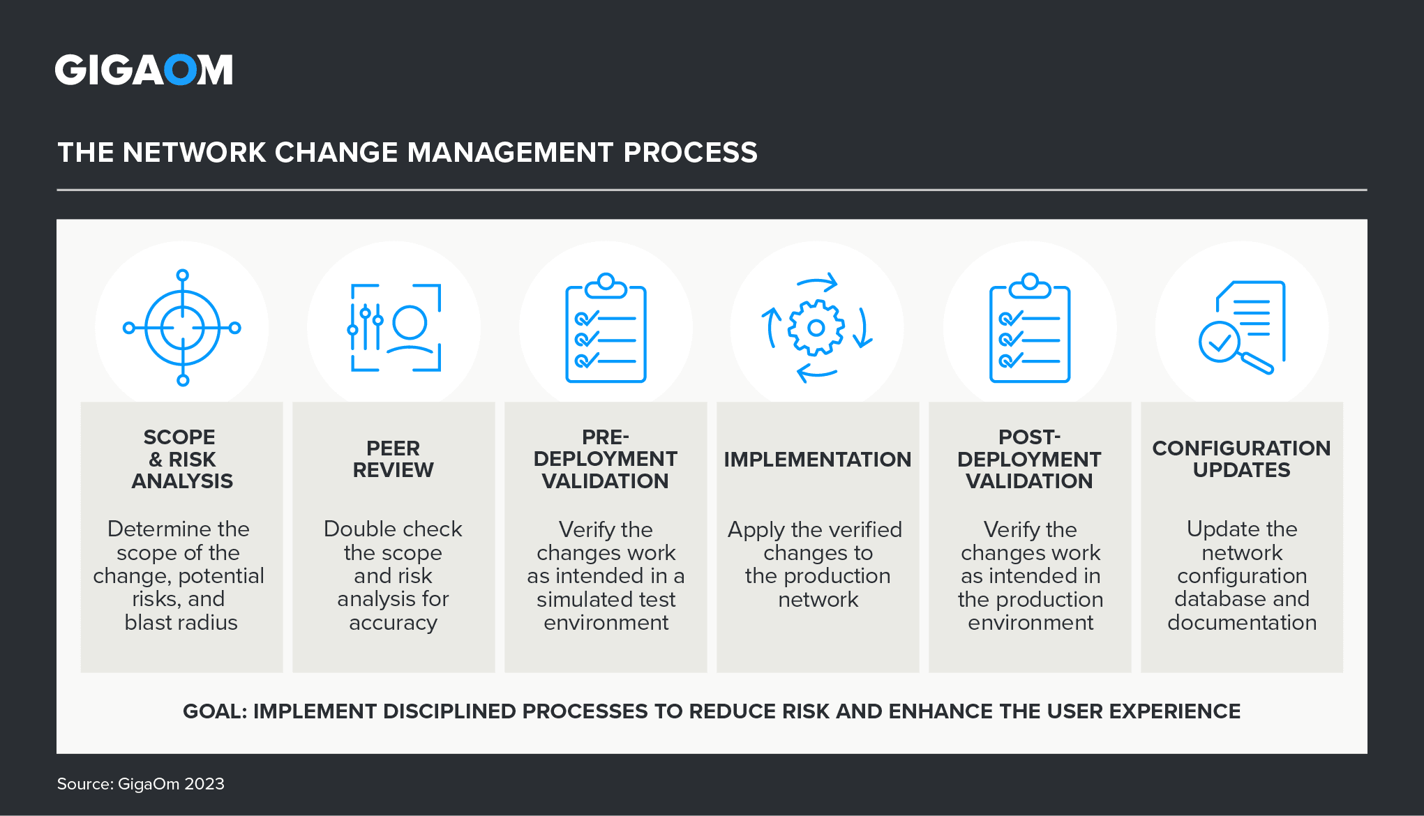 As a result, organizations require a modern, disciplined approach to network change management, ensuring compliance across all network devices and services. Figure 1 depicts the network change management process required to maximize the uptime of business-critical applications and processes while enhancing the user experience. While scope determination, risk analysis, and peer review are manual processes, validating network changes both before and after implementation needs to be automated, accelerating the process and reducing risk by injecting consistency and discipline.