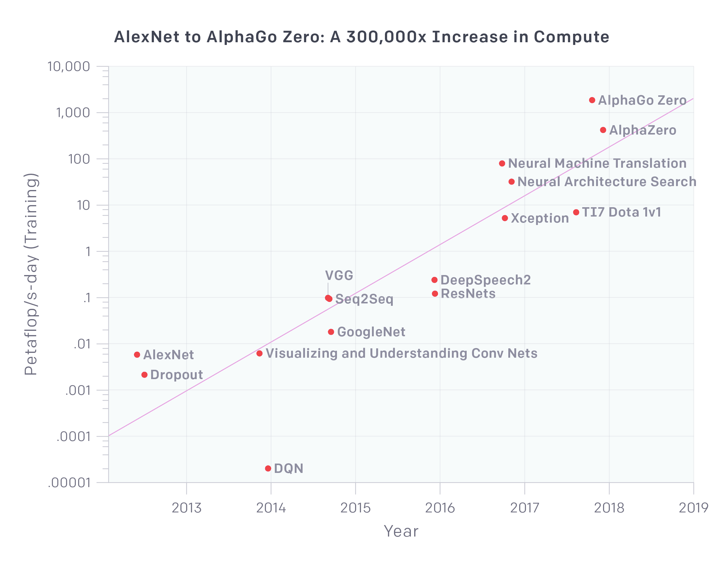 Since 2012, the amount of computation used in the largest AI training runs has been increasing exponentially with a 3.5 month doubling time (by comparison, Moore’s Law had an 18 month doubling period).