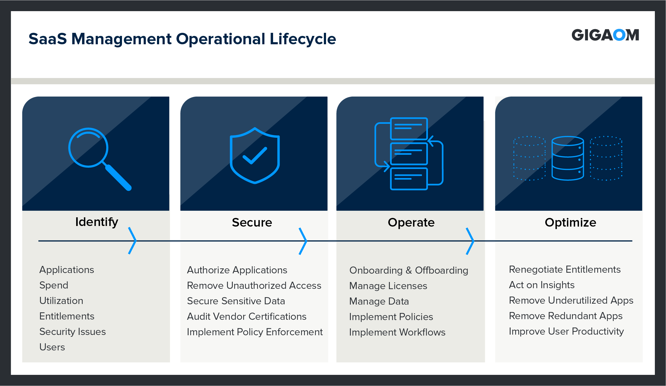 A SaaS Management Platform (SMP) provides visibility into a company’s SaaS applications by integrating company operational and SaaS application usage data. The dashboards show a consolidated view of the application utilization, spend, security status, access patterns, and contract entitlements. SMPs automate user management, license management, data management, security policy enforcement, alerting, and auditing. SMPs enable improved security compliance, operational efficiencies, SaaS application ROI, optimized entitlements, and user productivity.