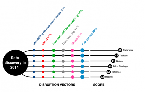 Currently Datameer and Tableau are the best-positioned data-discovery suppliers. Splunk, MicroStrategy, and SiSense are also strong, and Roambi is on the radar.