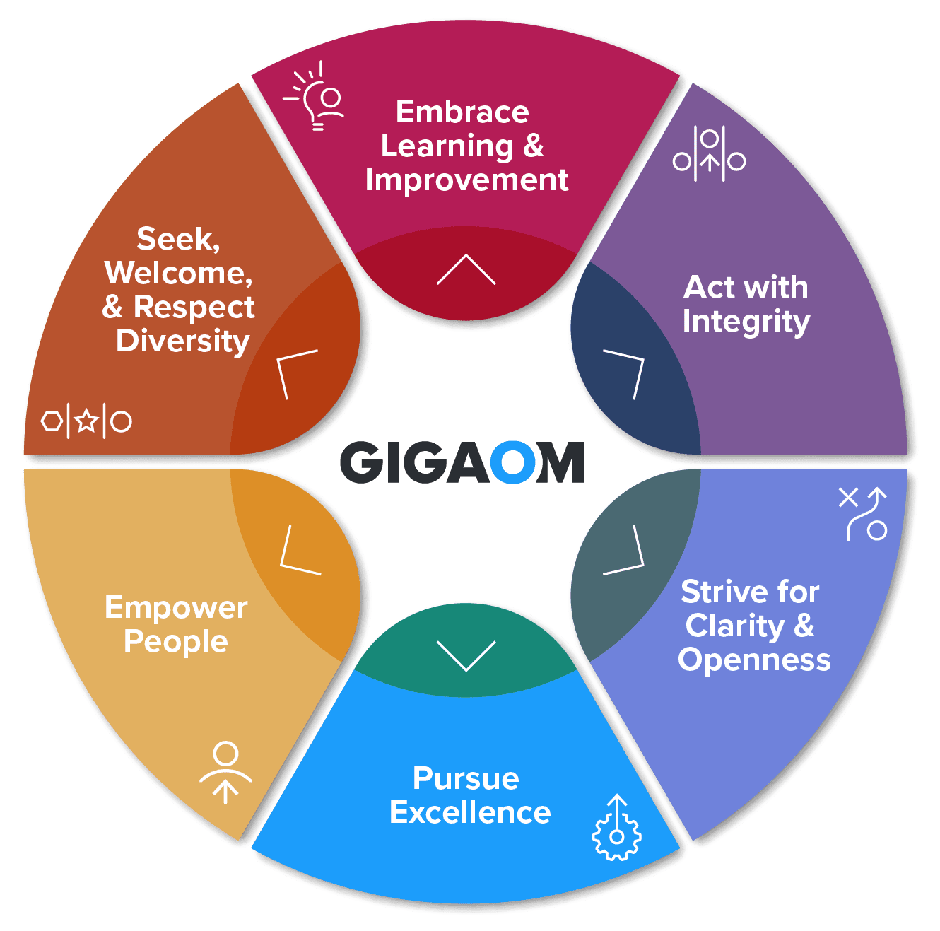 It is my distinct honor to be part of the team at GigaOm that has put structure around these intangibles of culture, value, and norms, and is dedicated to cultivating them and keeping the organization accountable for living up to them. I am proud of the values we created and for putting them into a wheel format to demonstrate how each value is of equal importance.