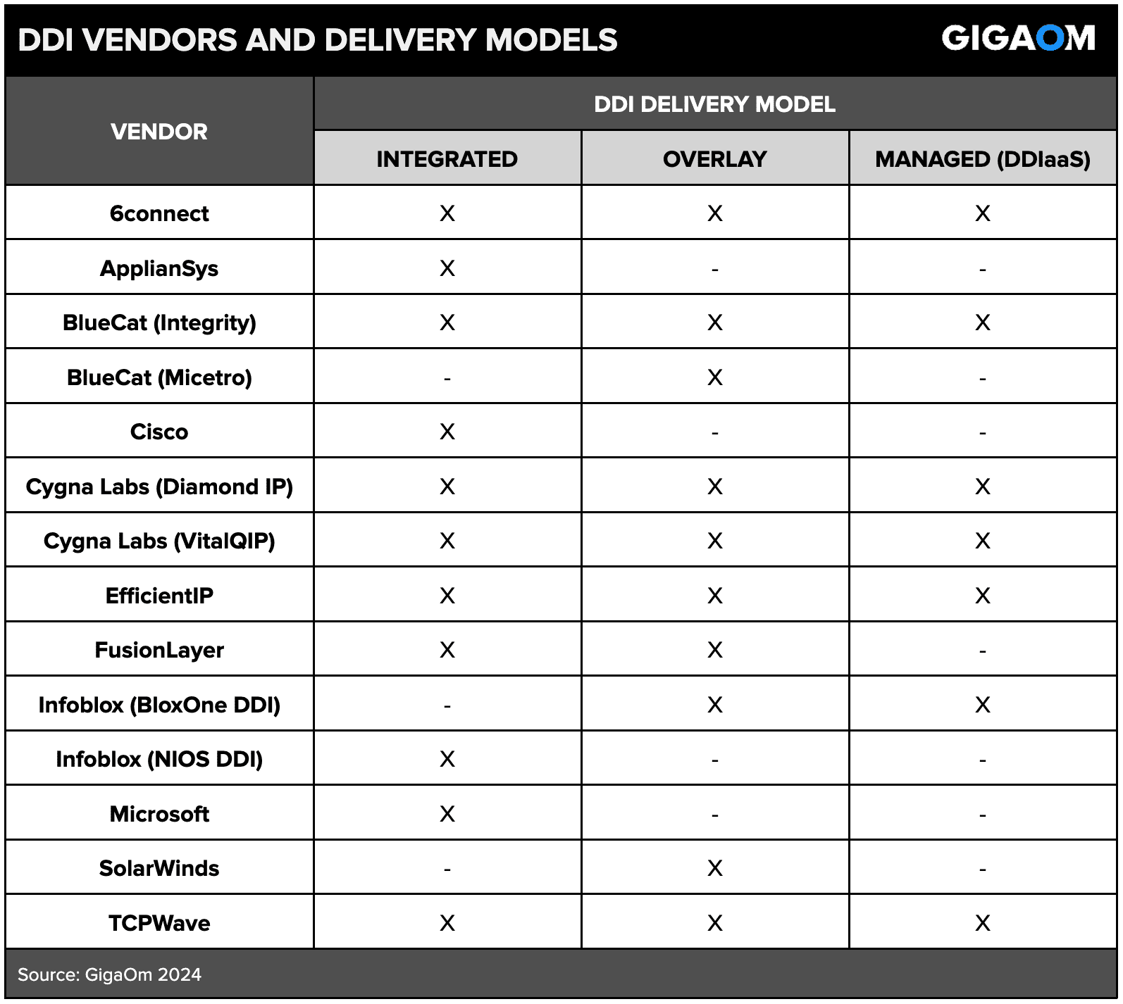 With so many different DDI solutions and the landscape evolving, choosing the best option for your organization depends on your use cases, existing DNS and DHCP solutions, architectural choices, and in-house capabilities. Your current environment, growth plans, and in-house skill sets will most likely influence your decision about adopting an integrated, overlay, or managed DDI solution. Figure 1 outlines the delivery model for each solution we’ll cover in this report.